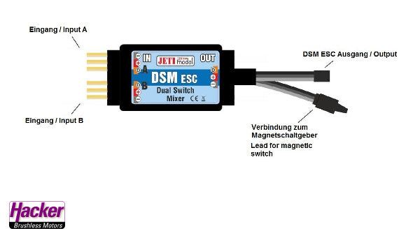 The voltage from the electronic controllers connected to the inputs of the DSM ESC is constantly measured and supplied directly to the output by the DSM ESC’s internal processor. The DSM ESC then automatically switches between the inputs so that your receiver is always powered by the power supply with the higher voltage. The signal outputs are interconnected. The DSM ESC output is fitted with a JR connector that can connect the output directly to the receiver. The other JR connector, male, is used to connect an electronic switch, a magnetic switch, or an RC Switch. The DSM ESC can also be operated without an electronic switch. Then, DSM ESC is permanently switched on and functions only as a voltage combiner. The DSM ESC is not equipped with a voltage regulator circuit for the connected batteries or voltage supplies. The voltage at the DSM ESC output will always be equal to the voltage of the input with the higher voltage. Make sure that your receiver, servos and other equipment supplied by the DSM ESC are designed for the voltage being supplied.